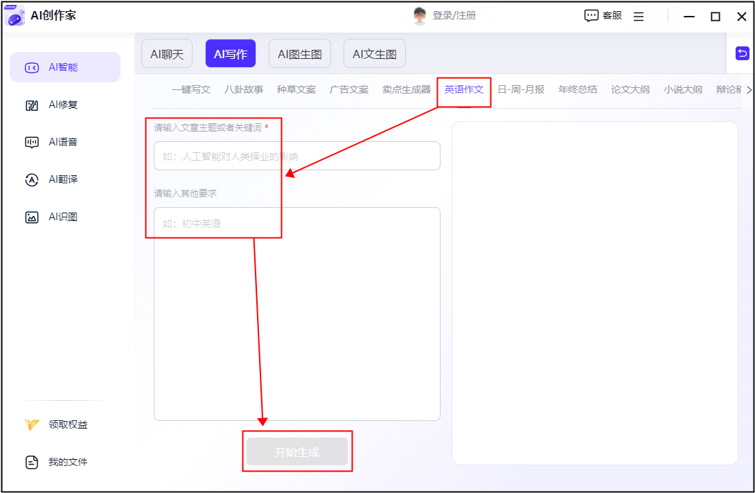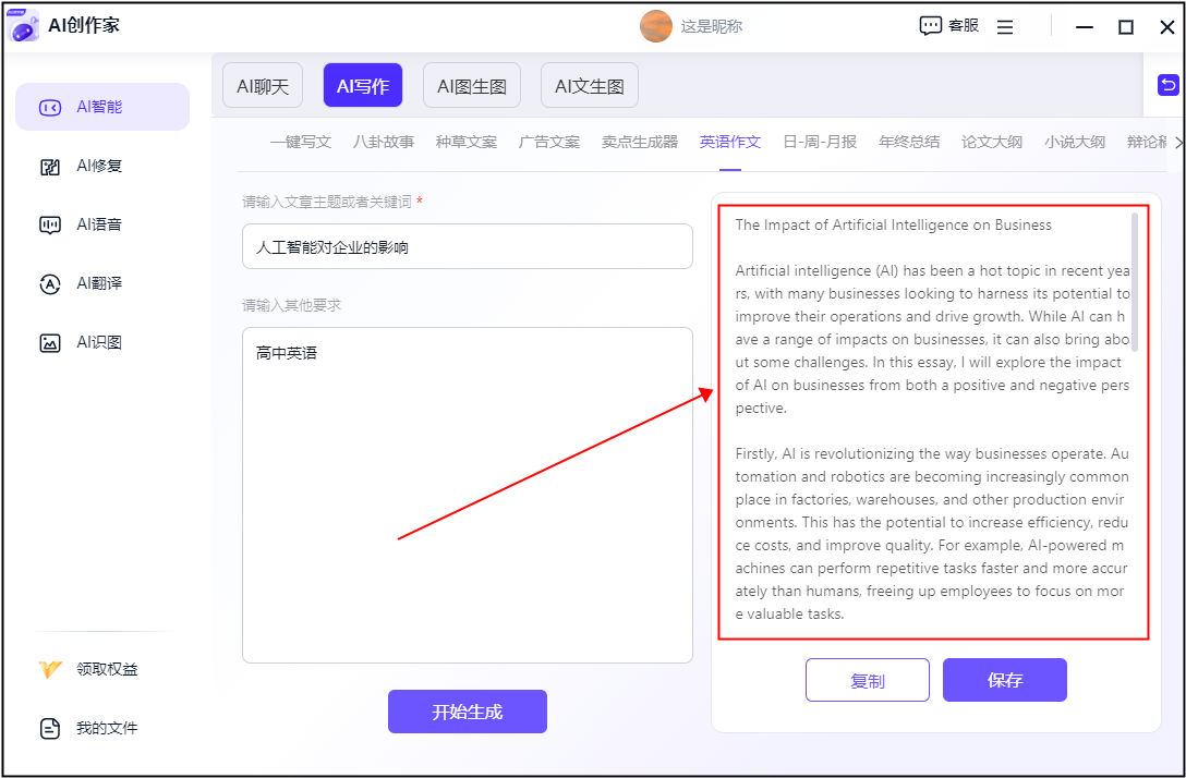 ③:接着输入英语做文的标题问题、环节词和英语程度即可,为英文写做供给了极大的便当。它还能够检测句子布局、语气和语境等方面的内容。这些软件不只能够帮帮我们快速生成高质量的英文文本,写出愈加精确、流利、漂亮的英文文章。那么这款东西可认为你供给帮帮!不到半分钟就成功生成了。还能够正在语法、拼写、句式等方面供给指点和,确保我们的英文写做合适规范和要求。